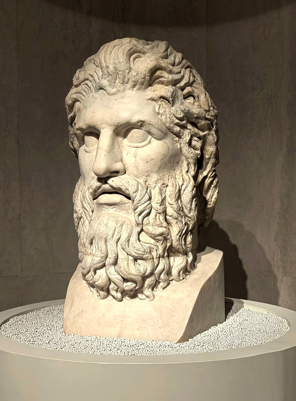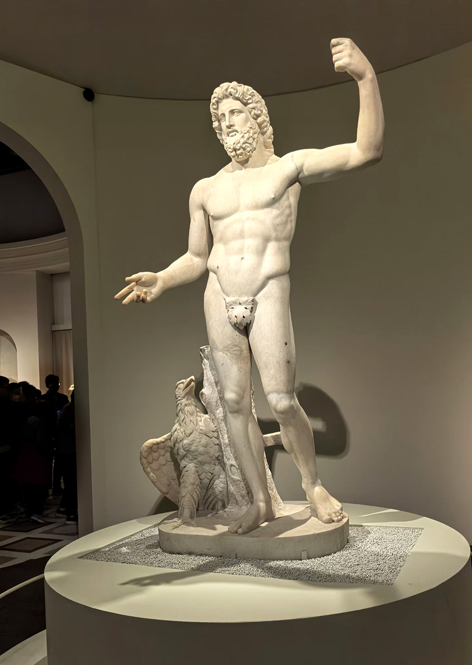 Upon entering the exhibition, visitors are first greeted by “The Legends of the Gods.” Here, the spiritual structure of Greek mythology clearly overlaps with the practical needs of Roman political culture. The 2.27-meter-tall statue of Zeus—known as Jupiter in the Roman system—is not merely an image of a celestial deity. He inherits the supreme authority of the king of the gods from the Greek world, while in the Roman context he is endowed with a stronger sense of order and law. Jupiter is not only the wielder of thunder but also the guardian of state oaths and the legitimacy of power. Echoing this is the bust of Poseidon (Neptune), god of the sea and earthquakes. His significance grew during Rome’s expansion—when Rome evolved from a city-state into an empire, the sea was no longer merely a natural space but a conduit for trade, warfare, and colonization. The image of Neptune thus symbolizes Rome’s incorporation of natural forces into imperial order. Minerva (the Greek Athena) represents yet another path of transformation. Originally the goddess of wisdom, warfare, and craftsmanship, she gradually became, within the Roman system, a symbol of rationality, technology, and the capacity for state governance. Her statue in the gallery does not emphasize feminine softness, but instead conveys calmness, restraint, and solidity—precisely the Roman understanding of “wisdom.”