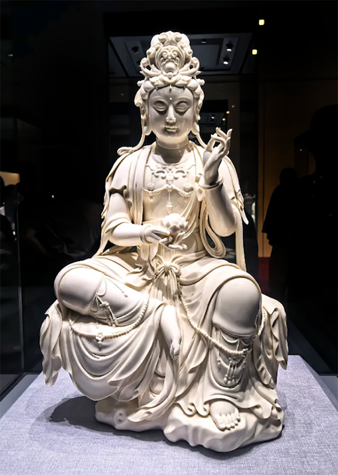 In the mid-to-late Ming dynasty, Dehua blanc de chine reached its peak: with extremely low iron content, refined and white bodies, and glaze as creamy as lard, it developed its distinctive “ivory white” and “pork-fat white.” Sculpture art flourished, with famous craftsmen such as He Chaozong emerging. Representative works included Guanyin figures, Luohans, and refined scholarly objects. Large quantities were exported to Europe, especially via Portuguese and Spanish maritime routes, where they were known as Blanc de Chine and had a profound impact on European taste and the development of white porcelain.