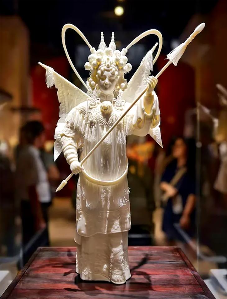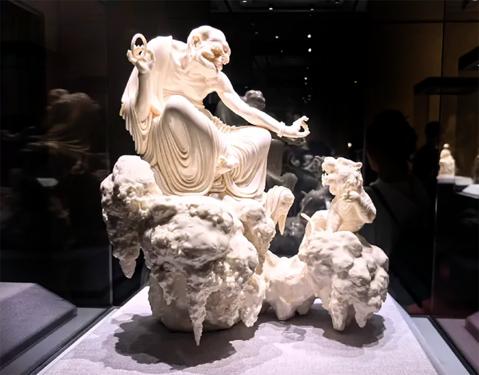 The first section focused on contemporary Dehua masters “upholding tradition while innovating,” showcasing representative works such as Expo Tripod, Mythology, and Brilliant Colors · Wish-fulfilling Buddha of Many Treasures.