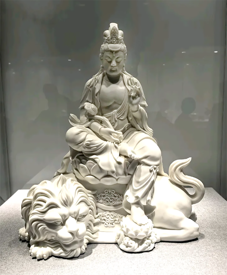 Dehua porcelain clay is low in iron and titanium, producing a semi-translucent milky white after firing, with fineness comparable to jade, praised in the West as “mutton-fat jade among porcelains.” The key craftsmanship lies in the combined processes of “subtractive modeling—trimming—incising—appliqué,” which together achieve the flowing movement of drapery and the softness of facial features. This integrative sculptural method differs from the painted blue-and-white tradition of Jingdezhen, aligning it more closely with pure sculpture.