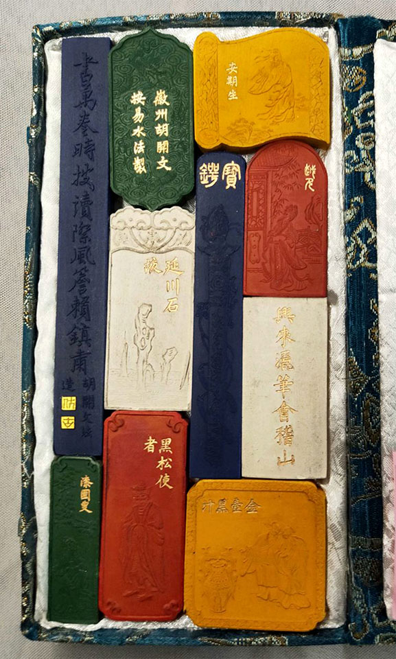 在中国的制墨史上,宋代有潘谷、张遇、叶茂实等名家。如潘谷手制的“松丸”、“狻猊”等墨,“遇湿不败”,“香彻肌骨,磨研至尽而香不衰”,被誉为“墨中神品”。而明代是徽墨的鼎盛时期,最著名的制墨名家有罗小华、程君房、方于鲁。罗小华的桐油墨、程君房的漆涸墨、方于鲁的名贵药构墨都是难得一见的珍品。程君房自诩“吾墨百年之后金不换”。此明代三大家的墨式样多样,装饰华丽,图案精美,争奇斗艳,“五岳真形阁”、“东岳泰山赞”、“九鼎图”、“百雀图”均是珍品。清代有曹素功、汪近圣、胡开文、汪节庵的”四大制墨名家”,其中曹素功的“紫玉光”、“苍龙珠”,胡开文的“御园图墨”、“御制棉花”,汪近圣的“耕织图”、“罗汉赞”等古墨,图案精美、人物刻画细腻,装潢考究,空前绝后。1915年,民国休宁胡开文出品的“地球仪墨”获巴拿马世界博览会金奖。